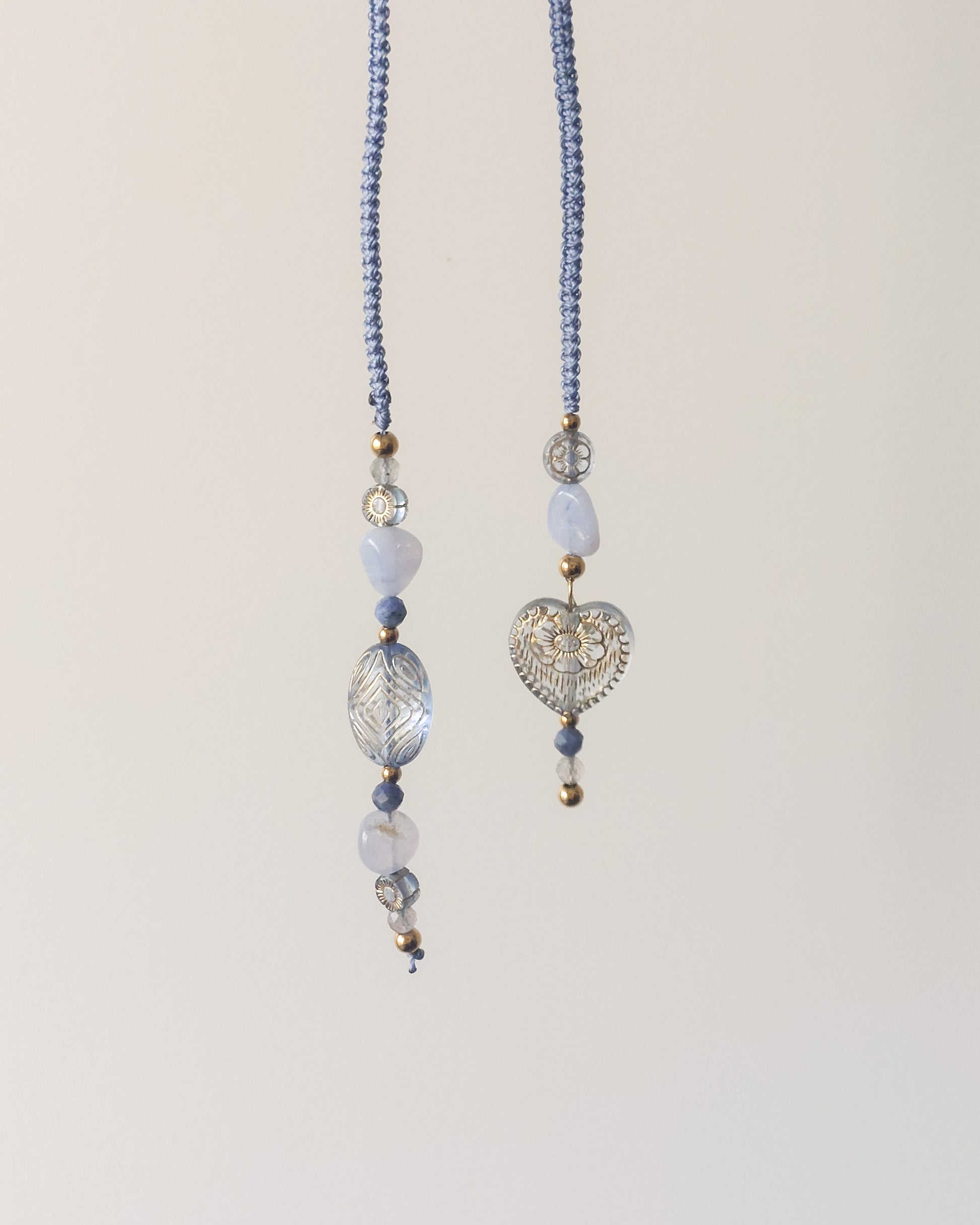 Materiaal: Macramédraad, acryl, RVS, natuurstenen (Blue Lace Agaat, Sodaliet & Labradoriet) & glaskralen.