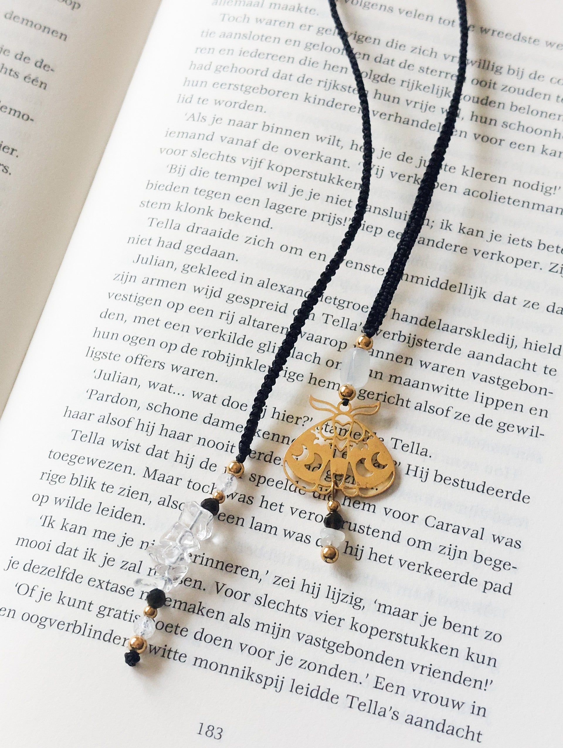 Materiaal: Macramédraad, gold plated RVS, natuurstenen (Gouden obsidiaan,maansteen & bergkristal)