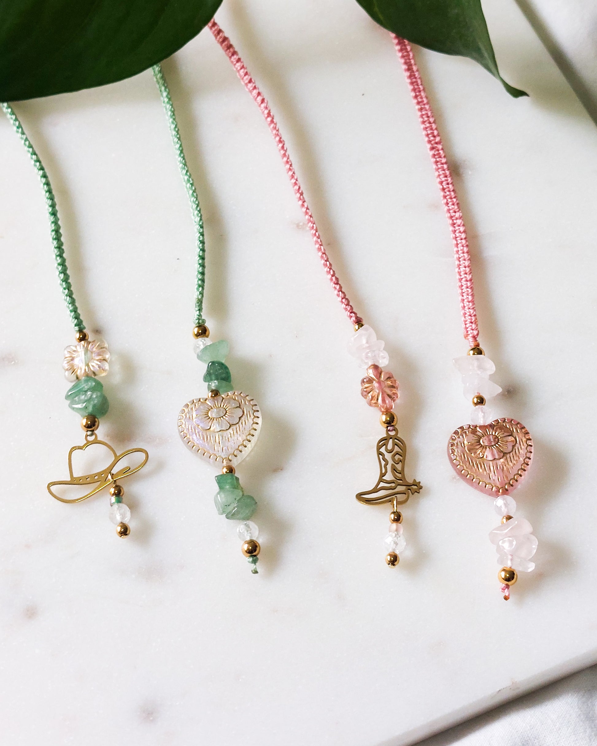 Kleur: Goudkleurig (RVS), Pastel groen (Touw), Groen/wit (natuursteen), diverse kleuren glas- en acrylkralen.