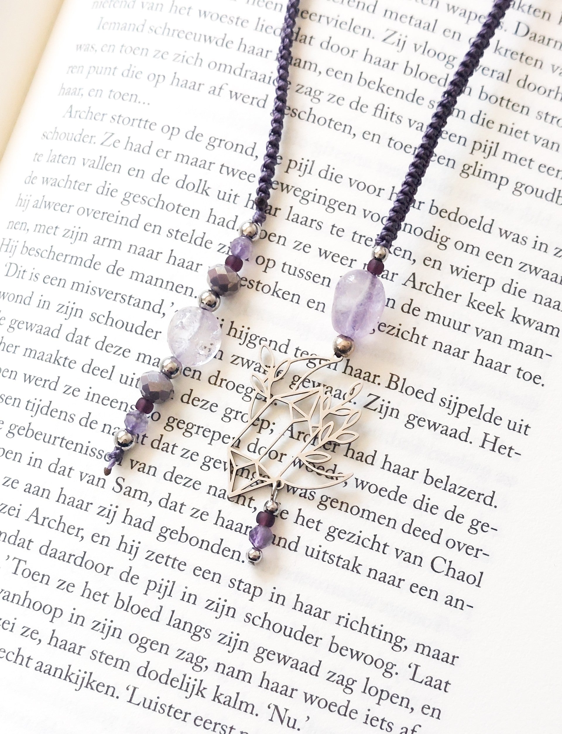Materiaal: Macramédraad, RVS, natuurstenen (Lavender Amethist/Amethist Facet) & glaskralen.